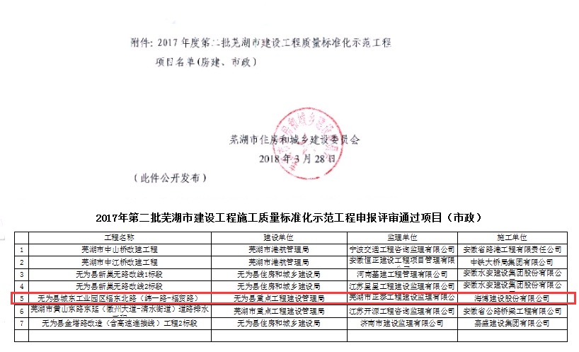 2018年03月28日,芜湖市住房城乡建委公布了我公司承建的无为县城东工业园区福东北路(纬一路-福贸路)工程荣获“2017年度第二批芜湖市建设工程施工质量标准化示范工程”称号。
