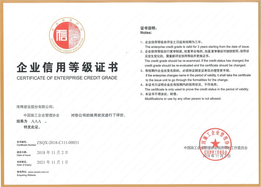 12月4日,从中国施工企业管理协会在北京召开的“2018年工程建设诚信企业推介大会”上传来喜讯,在2018年度工程建设企业信用评价工作中,我司信用等级被评定“AAA”级,这是继水利部给予评定的“AAA”级之后,荣获的第二项国家主管行业协会颁发的信用等级证书。
