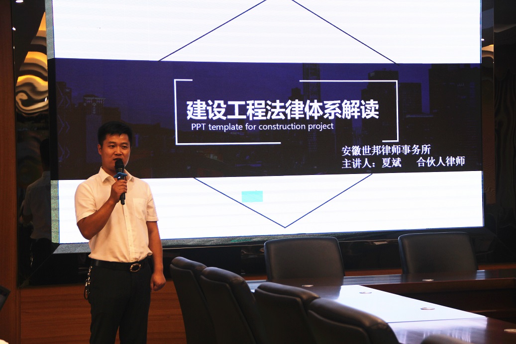 本次培训《建设工程法律体系解读》为主题,由安徽世邦律师事务所夏斌律师主讲。夏律师结合当下施工企业现状、现场解读有关法律法规、法院裁判规则,结合自己代理的案例分析其产生的原因并总结经验,系统的讲解了目前施工企业存在的法律风险及防控措施。在随后的交流环节中,夏律师从法律层面逐一解答了公司各板块及项目负责人目前存在的法律困惑和问题,为我们提供了富有成效的解决思路和方案,现场气氛活跃,效果良好。