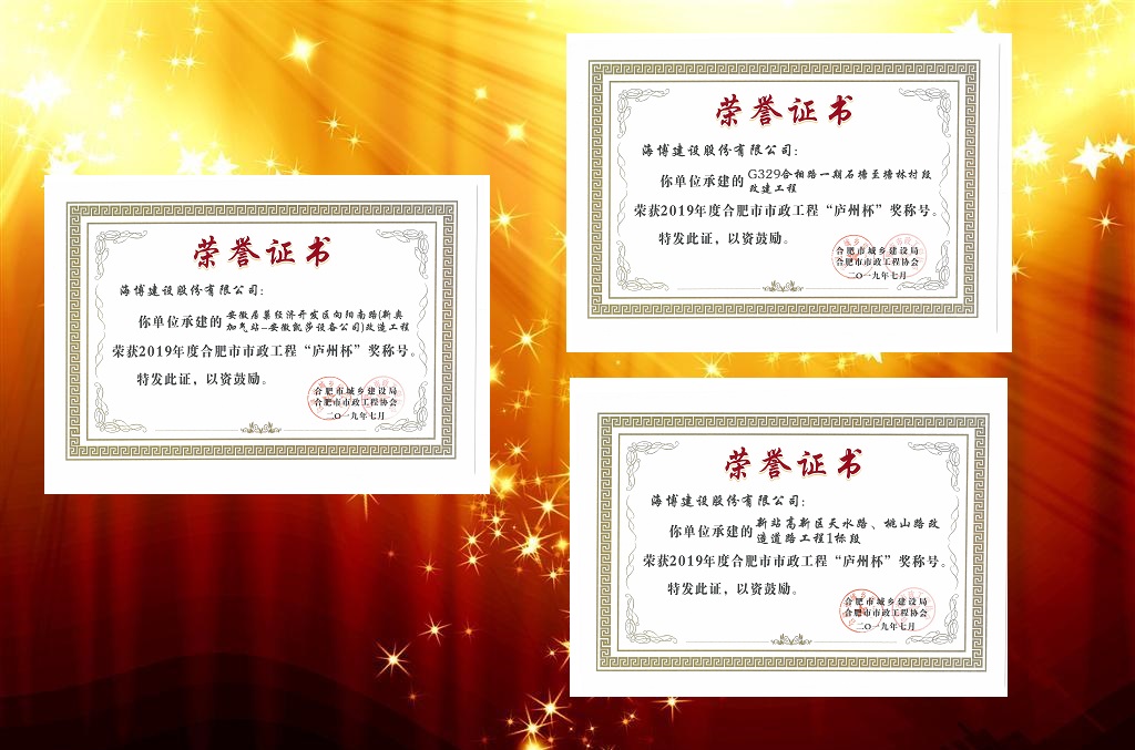 近日,由我公司承建的G329合相路一期石塘至塘林村段改建工程(总造价11338万元)、新站高新区天水路、桃山路改造道路工程1标段(总造价2371万元)及安徽居巢经济开发区向阳南路改造工程(总造价1108万元)三个项目喜获2019年度合肥市市政工程“庐州杯”奖称号。“庐州杯”奖是合肥市市政工程质量最高奖项,该奖项是由合肥市市政工程协会组织,经单位申报、部门推荐、资料初审、形式审查、现场复查、建委等相关部门研究、网上公示等程序产生,层层筛选、好中选优、优中选精。